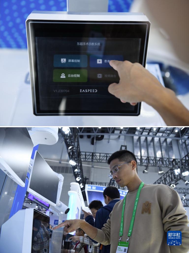 拼版照片:在2023世界制造業(yè)大會(huì )上,工作人員在演示一款基于“可交互空中成像”技術(shù)的非接觸式智慧醫療系統,工作人員無(wú)需接觸屏幕,便可直接于空中完成操控(9月23日攝)。