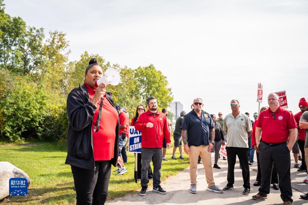 9月22日,在美國密歇根州貝爾維爾的通用汽車(chē)部件廠(chǎng)外,工會(huì )地區負責人在罷工游行現場(chǎng)講話(huà)。