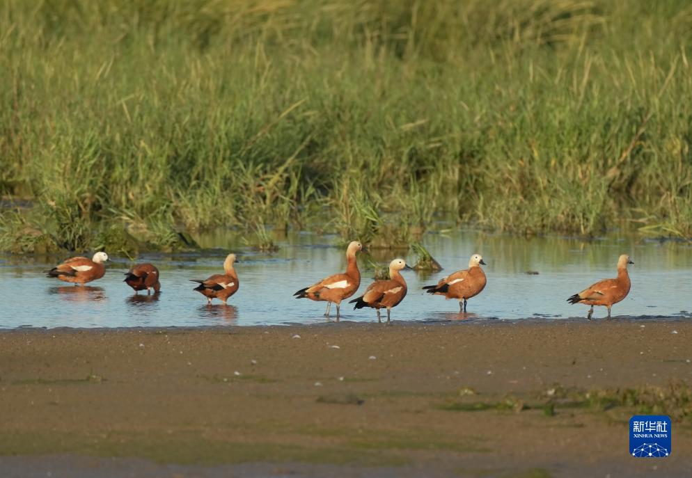 9月23日,一群赤麻鴨在河北省秦皇島市北戴河區沿海濕地覓食。