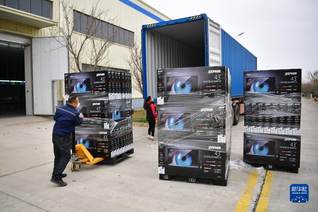 在西安國際港站附近的一家顯示器生產(chǎn)企業(yè)內,工人在裝箱產(chǎn)品,準備發(fā)貨(2022年3月17日攝)。