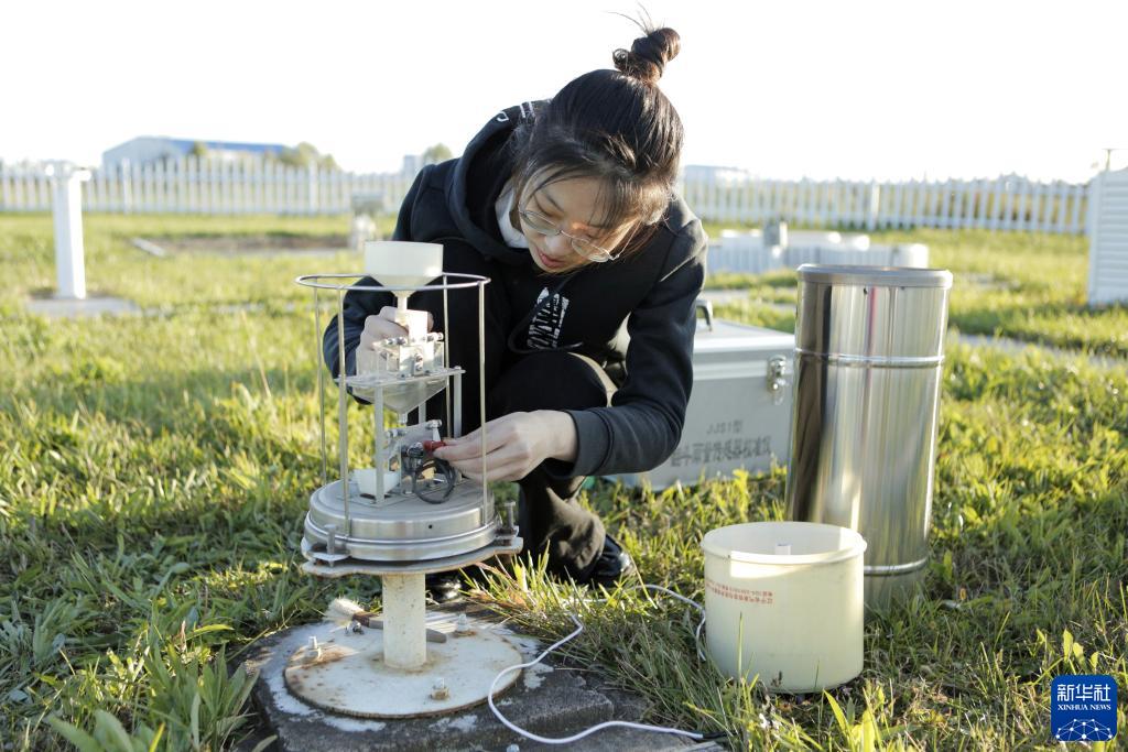 在富錦市氣象局觀(guān)測場(chǎng),氣象員楊清彤在維護翻斗雨量計(9月22日攝)。