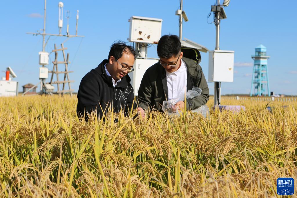 在富錦市現代農業(yè)萬(wàn)畝水稻科技示范園實(shí)驗基地,氣象員李辰暉(左)與王國泰查看水稻長(cháng)勢(9月22日攝)。