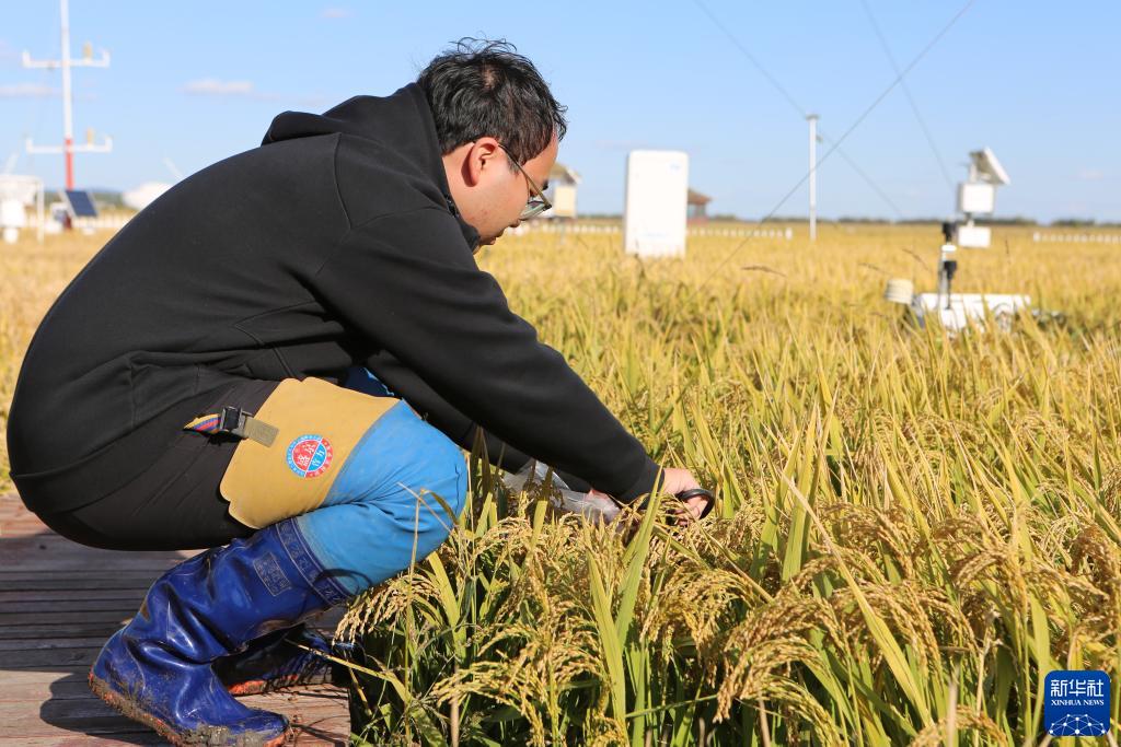在富錦市現代農業(yè)萬(wàn)畝水稻科技示范園實(shí)驗基地,氣象員李辰暉采集水稻樣本(9月22日攝)。