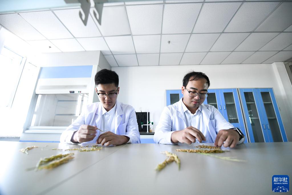 在富錦市現代農業(yè)萬(wàn)畝水稻科技示范園實(shí)驗基地,氣象員李辰暉(右)與王國泰在分離稻粒以進(jìn)行水稻灌漿速率試驗(9月22日攝)。