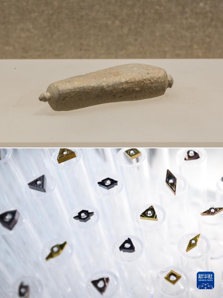 拼版照片:上圖為安徽省馬鞍山市含山縣的凌家灘遺址出土的石鉆(凌家灘遺址管理處供圖);下圖為2023世界制造業(yè)大會(huì )上展出的硬質(zhì)合金整體數控刀粒(9月23日攝,新華社記者張端攝)。