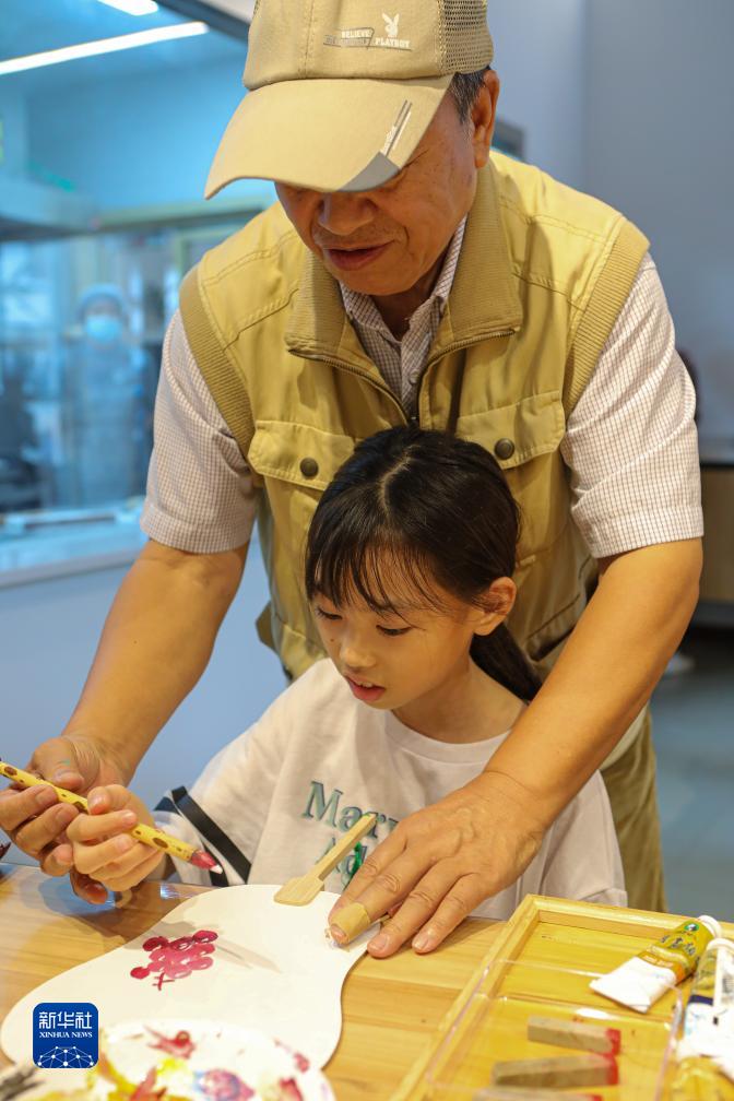 9月24日,在婁塘塌餅非遺傳承館,外國小朋友體驗畫(huà)扇面。