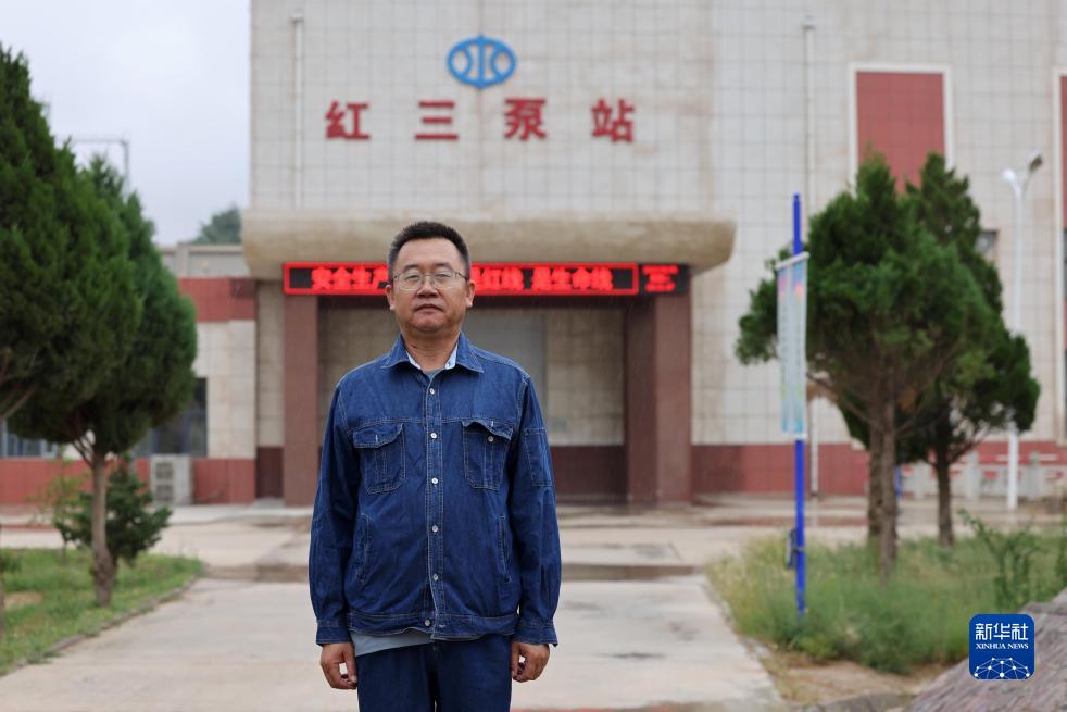 寧夏紅寺堡揚水管理處紅三泵站副站長(cháng)趙金柱在泵站機房前留影(9月7日攝)。
