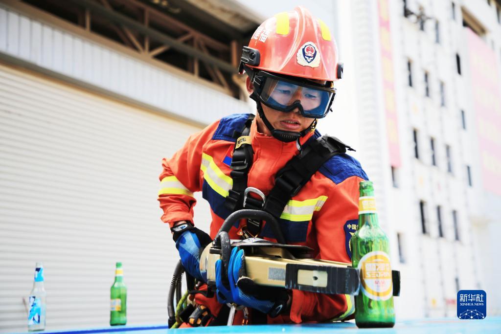 9月25日,在2023年福建省消防行業(yè)職業(yè)技能競賽現場(chǎng),消防員在“攻堅技巧”項目中操作液壓擴張器轉移啤酒瓶。