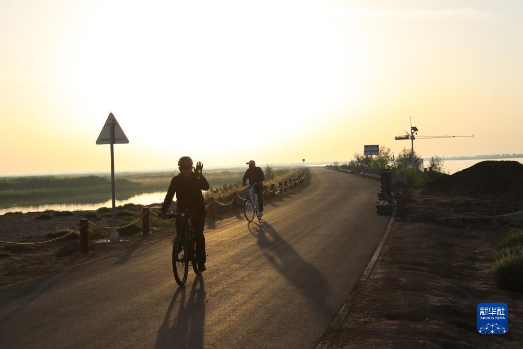 騎行愛(ài)好者在巴彥淖爾市境內的黃河畔騎行(9月15日攝)。