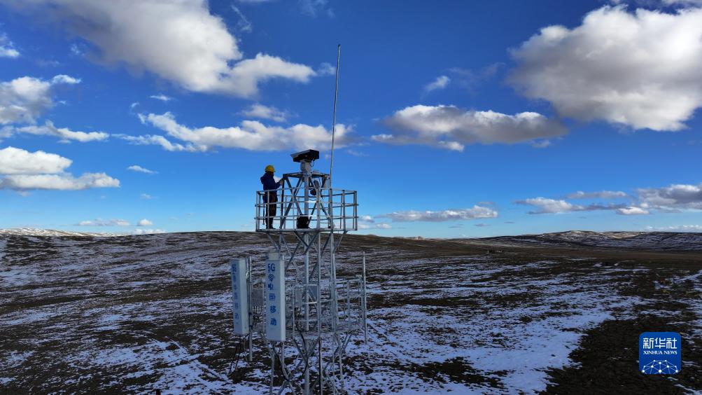 9月20日,中國移動(dòng)通信集團青海有限公司一名工作人員對黃河源流域約古宗列曲的5G基站進(jìn)行運維(無(wú)人機照片)。