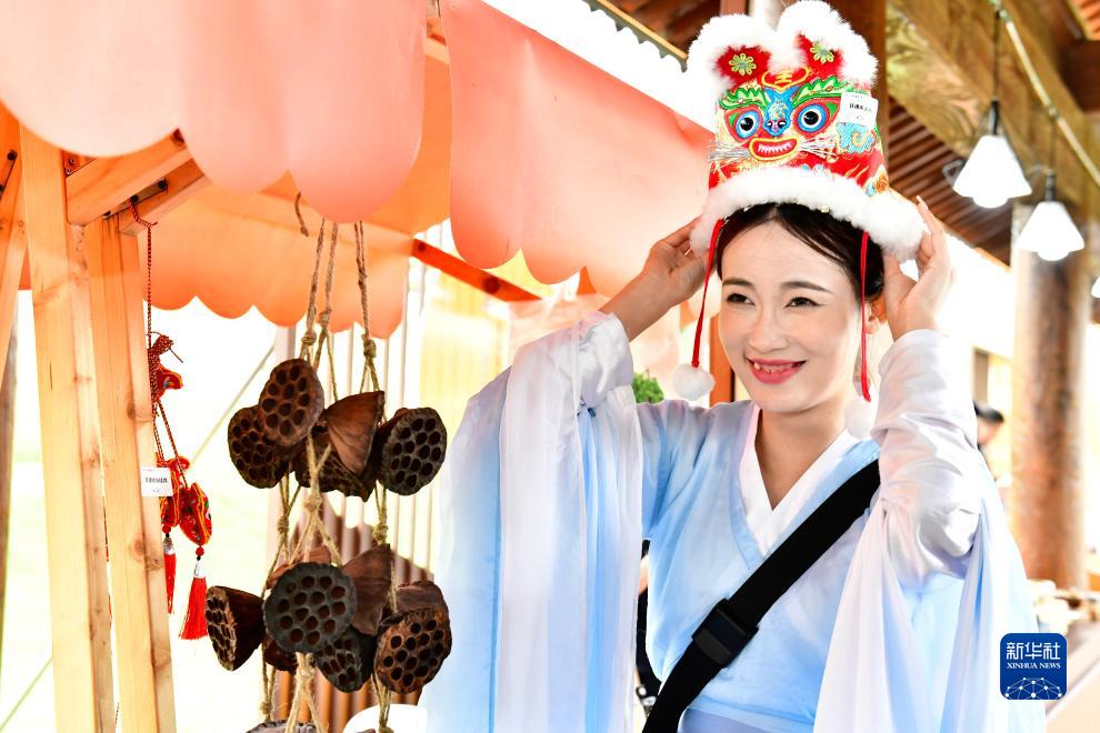 9月26日,在第九屆尼山世界文明論壇“山東手造”精品展區,與會(huì )人員在試戴虎頭帽。