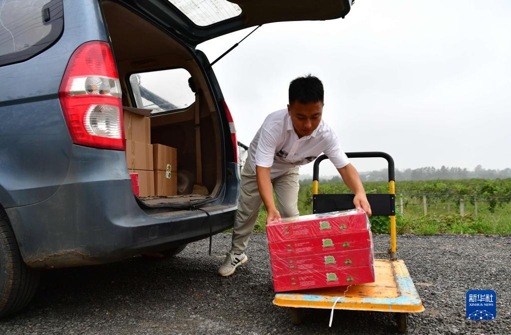 9月26日,段鵬飛在種植園里將包裝好的獼猴桃裝車(chē)。