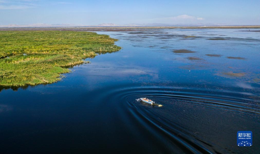 9月15日,在烏梁素海湖面上,武蓉、馮琛和劉瑩慧乘坐快艇去采集湖水樣本(無(wú)人機照片)。