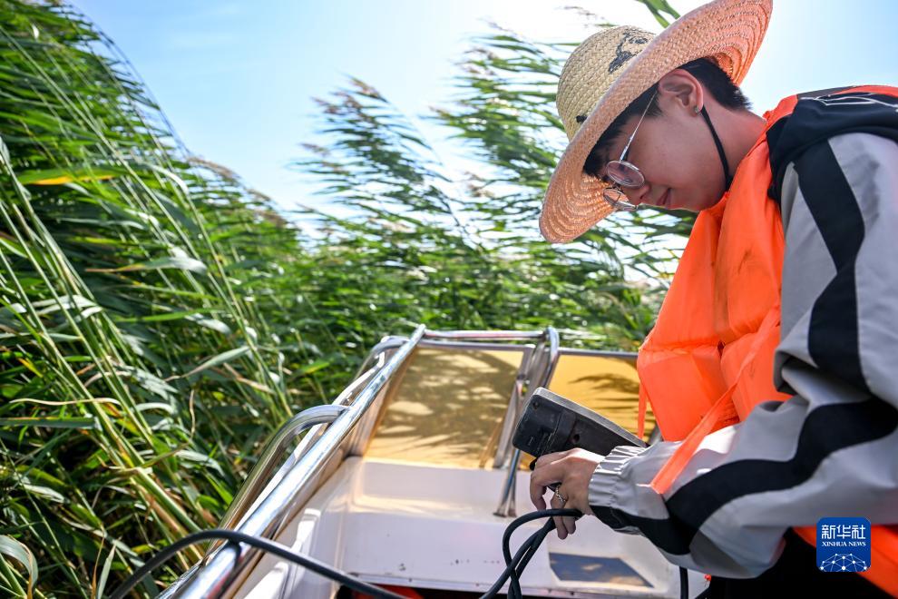 9月15日,在烏梁素海湖面上,武蓉測量水質(zhì)。