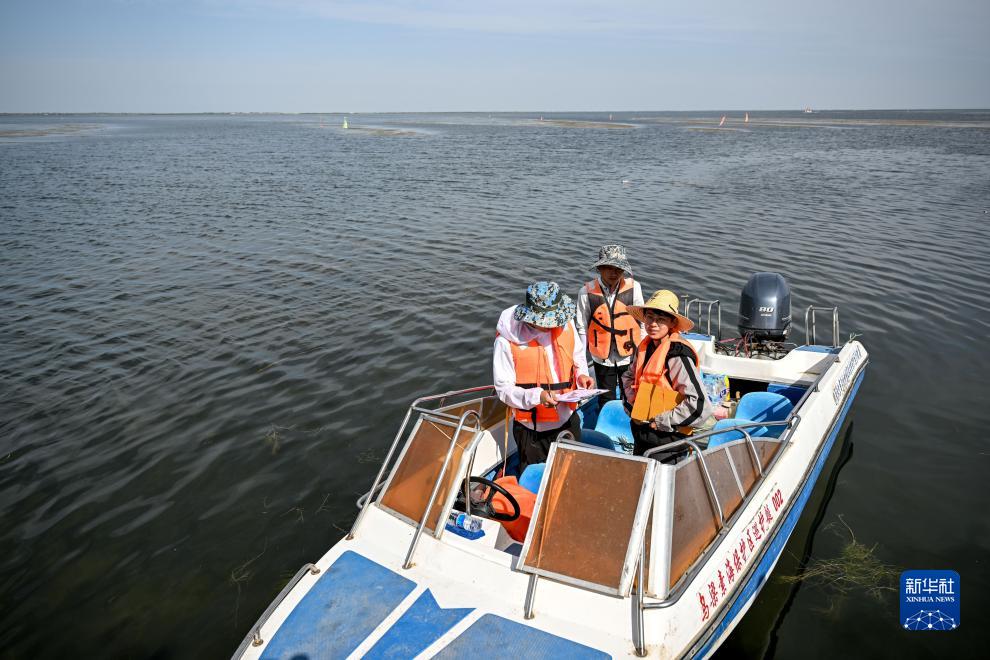 9月15日,在烏梁素海湖面上,武蓉(右一)、馮?。ㄗ笠唬┖蛣摶蹨蕚涑俗焱ゲ杉畼颖?。