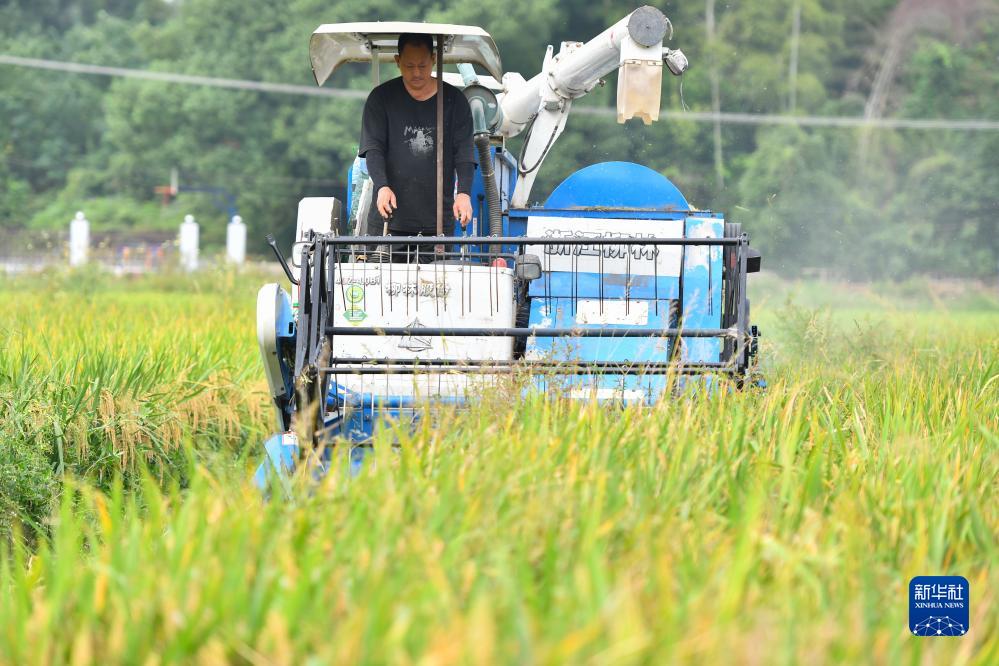 9月27日,在瀏陽(yáng)市沿溪鎮沙河村,農民駕駛收割機收割水稻。