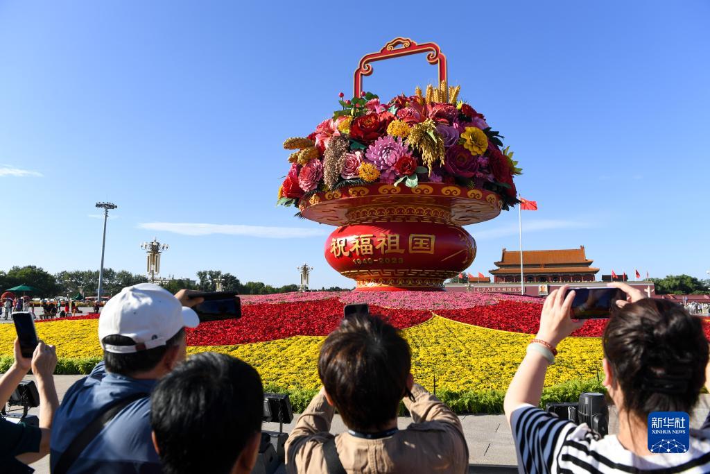 中秋及國慶節假期臨近,北京天安門(mén)廣場(chǎng)上的“祝福祖國”巨型花籃吸引著(zhù)眾多市民游客參觀(guān)游覽。