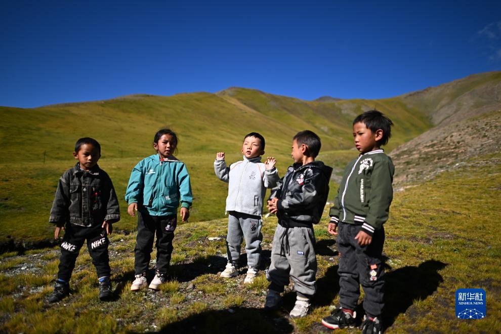 在青海省玉樹(shù)藏族自治州曲麻萊縣秋智鄉布甫村陽(yáng)光幼兒園,歐周挪吾(左三)和伙伴們在教室外的草原上唱歌(9月14日攝)。