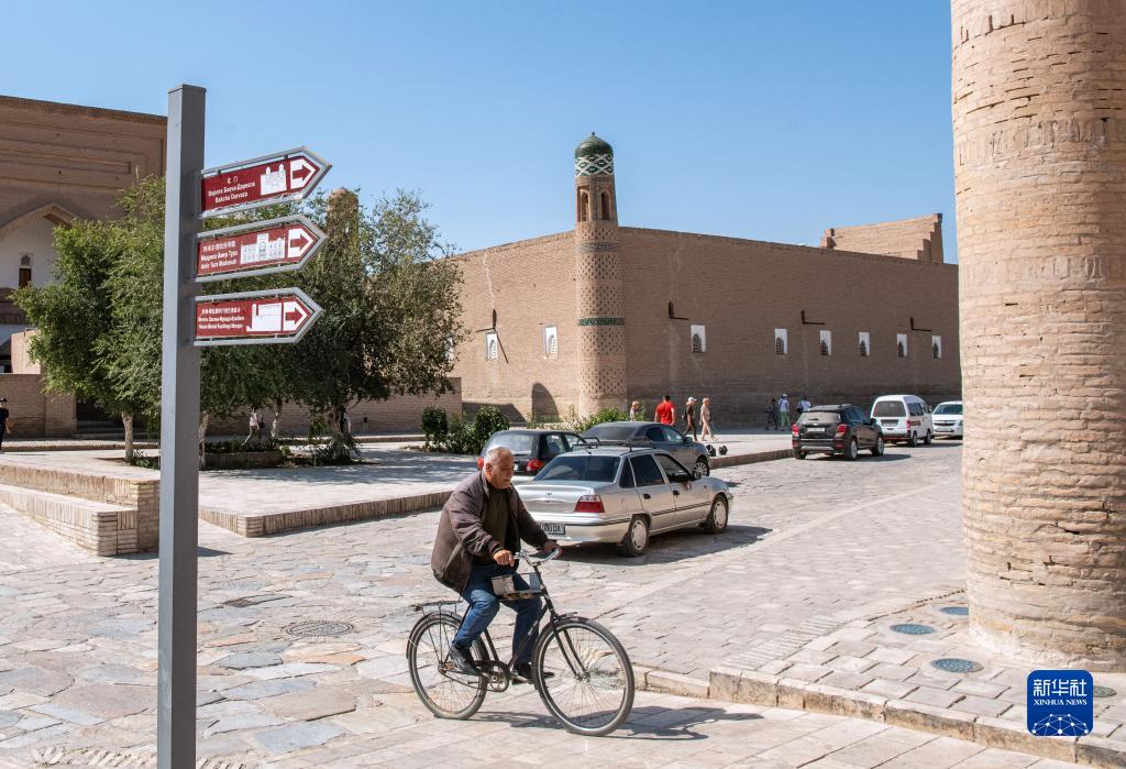 9月22日,在烏茲別克斯坦花拉子模州的希瓦古城,騎車(chē)人從古建筑路標旁經(jīng)過(guò)。路標指示出阿米爾·圖拉經(jīng)學(xué)院和哈?!つ吕聨焓矂e吉清真寺的位置,并有中文標示。