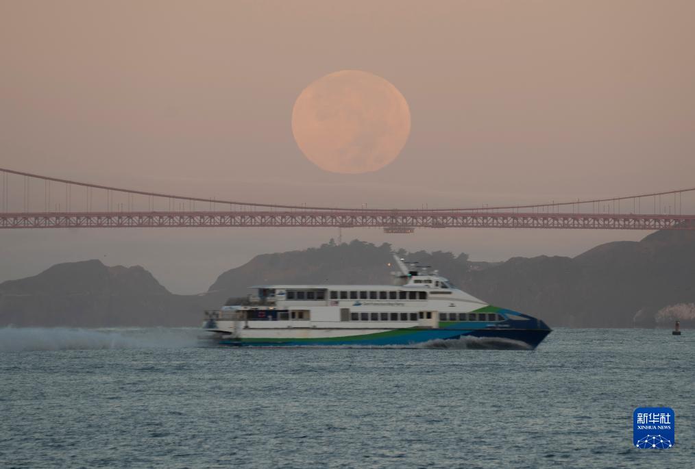 這是9月29日清晨在美國舊金山金門(mén)大橋附近拍攝的月亮。