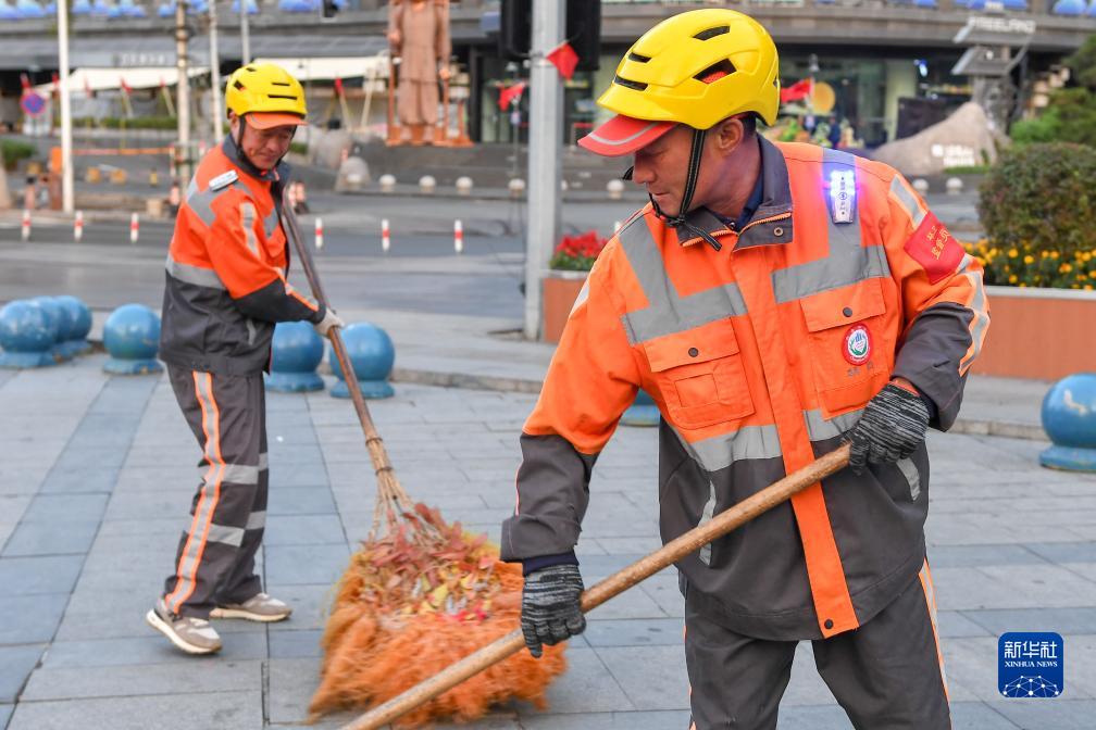 9月30日清晨,在吉林長(cháng)春市朝陽(yáng)區紅旗街與同德路交匯處,環(huán)衛工人畢永生(右)、廉士微在清掃人行步道。