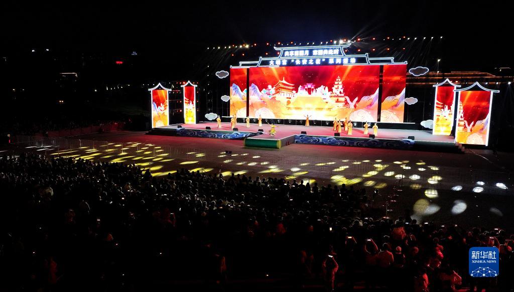 西安大明宮國家遺址公園內進(jìn)行的“長(cháng)安之夜”演出(9月30日攝,無(wú)人機照片)。