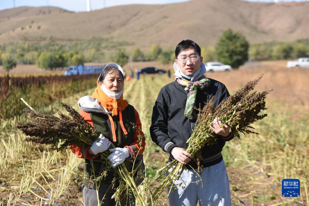 10月1日,在沽源縣白土窯鄉小西溝村,當地種植戶(hù)王秀梅和她的兒子趙擎宇抱著(zhù)收獲的紅藜麥合影。