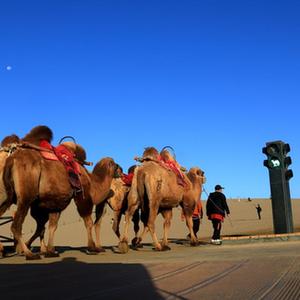 10月2日,甘肅省敦煌市鳴沙山月牙泉景區的交通信號燈“駱駝綠燈”亮時(shí),農戶(hù)牽著(zhù)駱駝?dòng)行蛲ㄟ^(guò)。