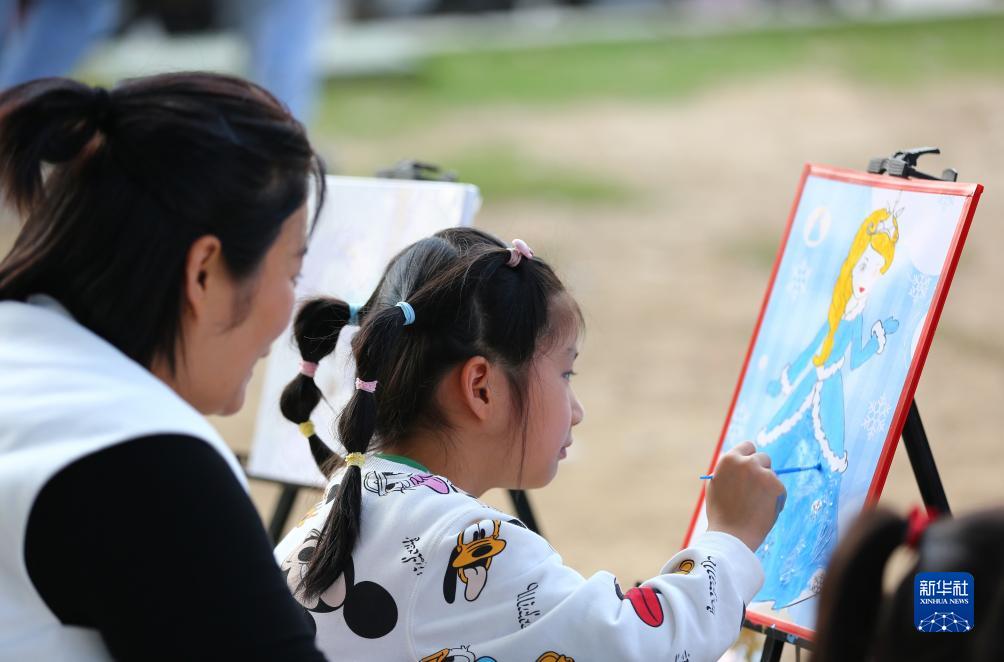 10月3日,家長(cháng)陪著(zhù)孩子在山東省滕州市弘道公園學(xué)習繪畫(huà)。