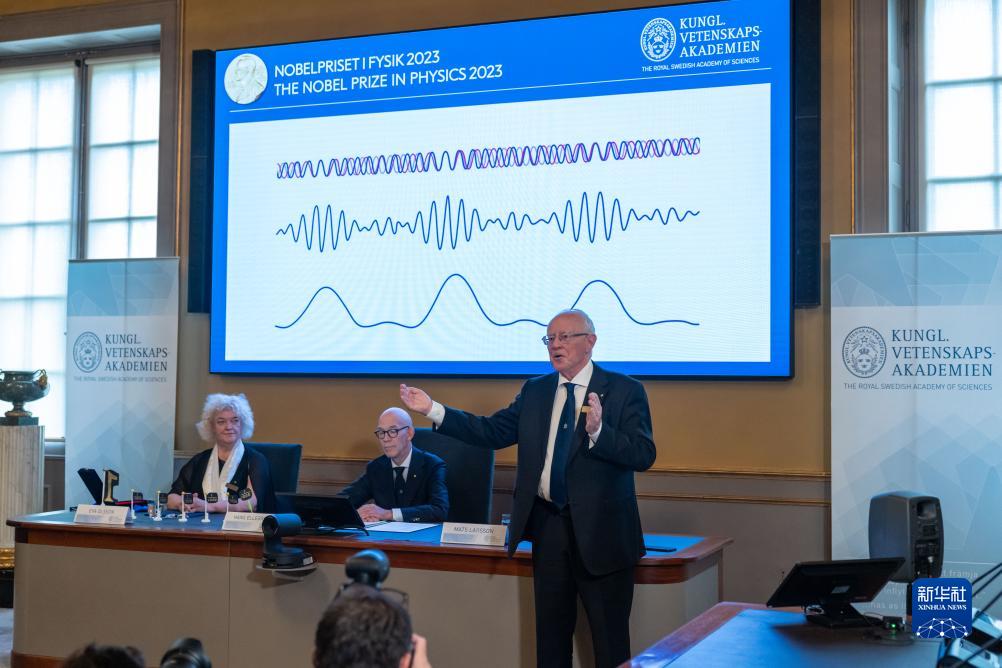 10月3日,在瑞典斯德哥爾摩舉行的2023年諾貝爾物理學(xué)獎公布現場(chǎng),評委會(huì )專(zhuān)家解讀今年諾貝爾物理學(xué)獎得主的研究成果。