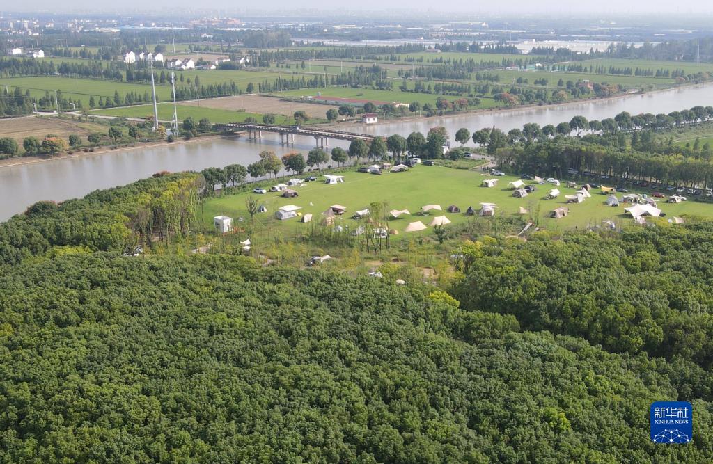 在上海松江區一處營(yíng)地,市民游客在河邊草地上搭起帳篷(9月29日攝,無(wú)人機照片)。