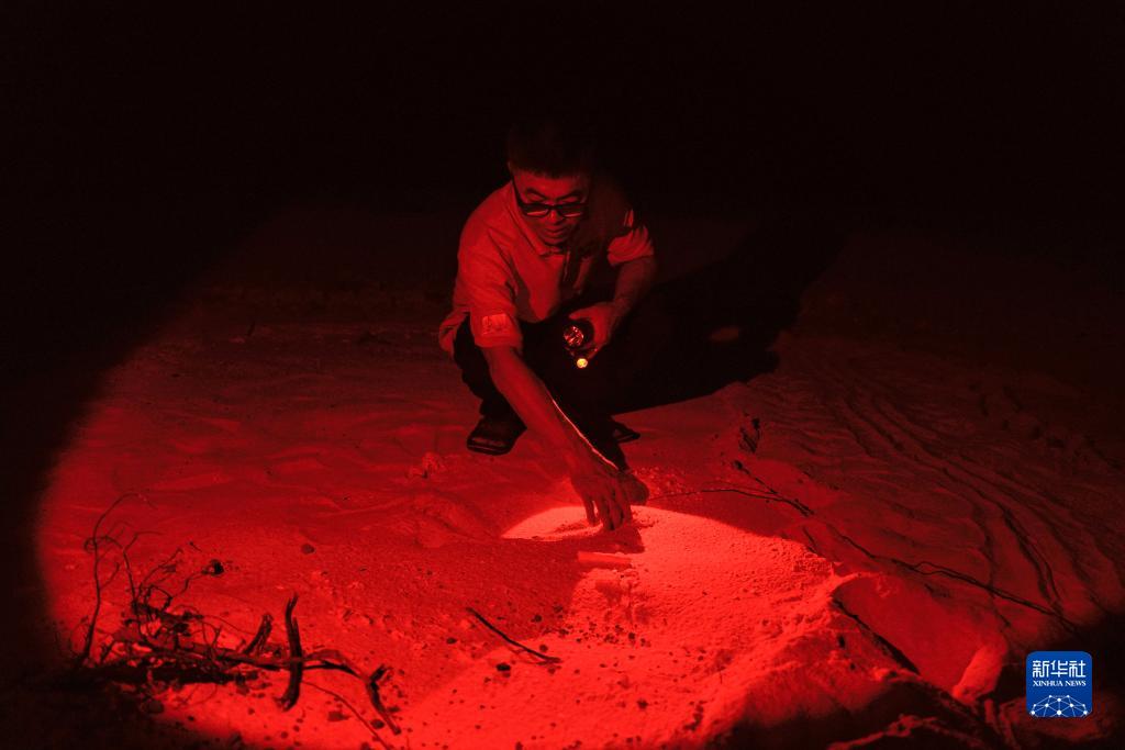 9月28日,黃程在夜晚觀(guān)察到海龜上岸產(chǎn)卵,查看海龜足跡。