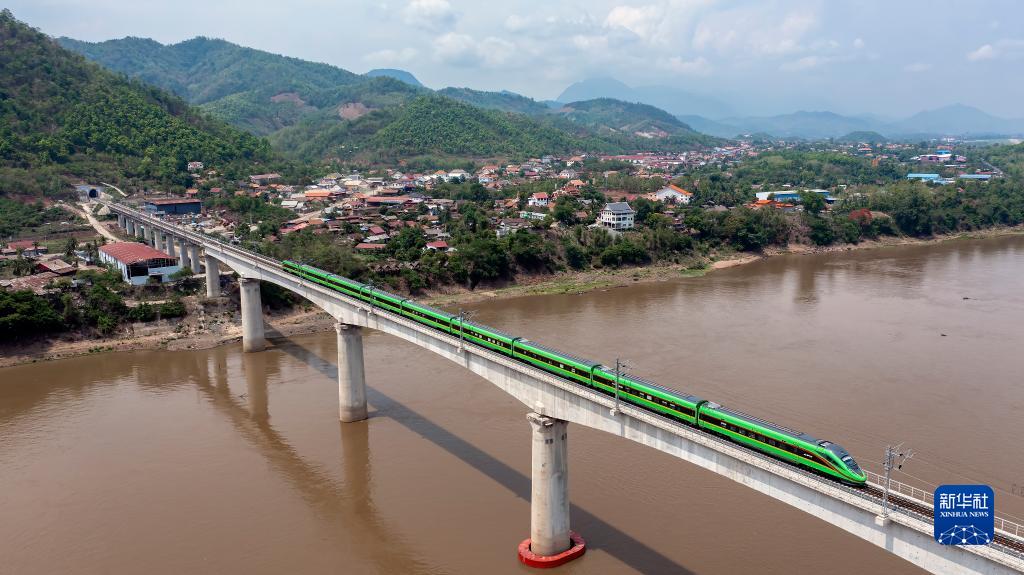 中老鐵路客運列車(chē)通過(guò)老撾瑯勃拉邦湄公河特大橋(2023年5月28日攝)。中老鐵路瑯勃拉邦湄公河特大橋全長(cháng)1458.9米,由28跨T梁和6跨連續梁構成,是全線(xiàn)施工難度最大、技術(shù)最復雜的橋梁。