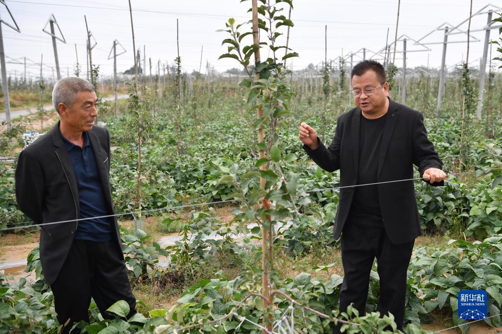 在宜川縣云巖鎮北赤村完成新品種改造的蘋(píng)果園內,縣農業(yè)部門(mén)的技術(shù)干部在為果農講解生產(chǎn)注意事項(9月27日攝)。