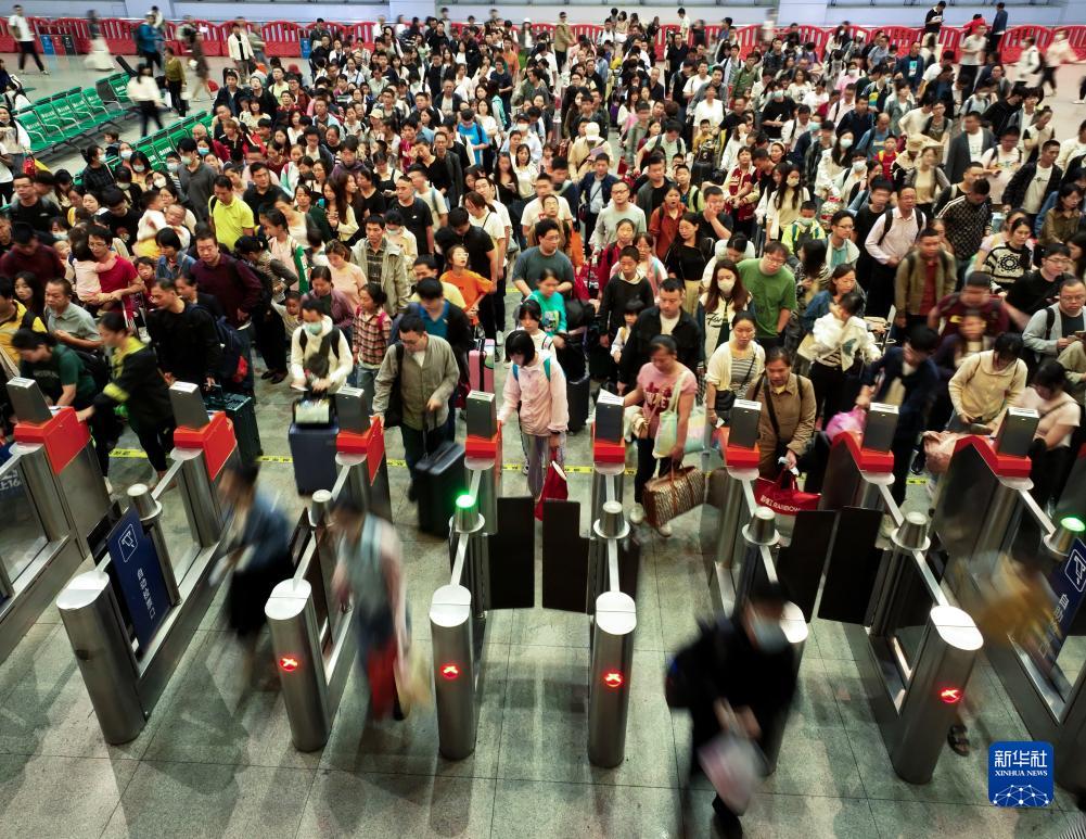 10月5日,鐵路湖南衡陽(yáng)東站候車(chē)室,旅客排隊過(guò)閘機驗票進(jìn)站上車(chē)(無(wú)人機照片)。