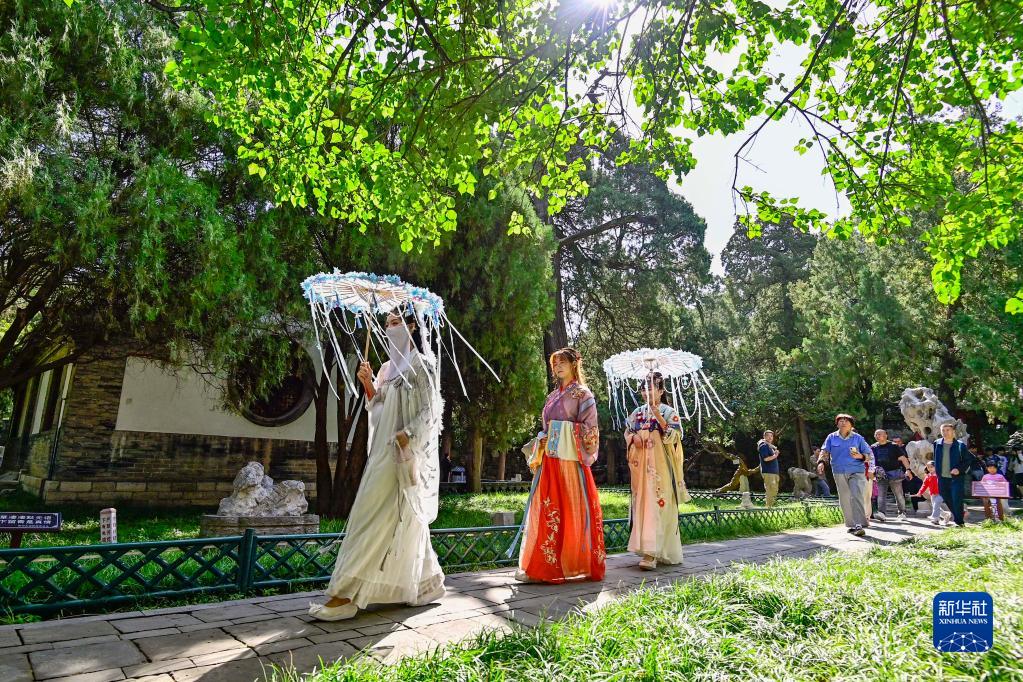 10月5日,游客身著(zhù)傳統服飾行走在山東省青州古城景區。