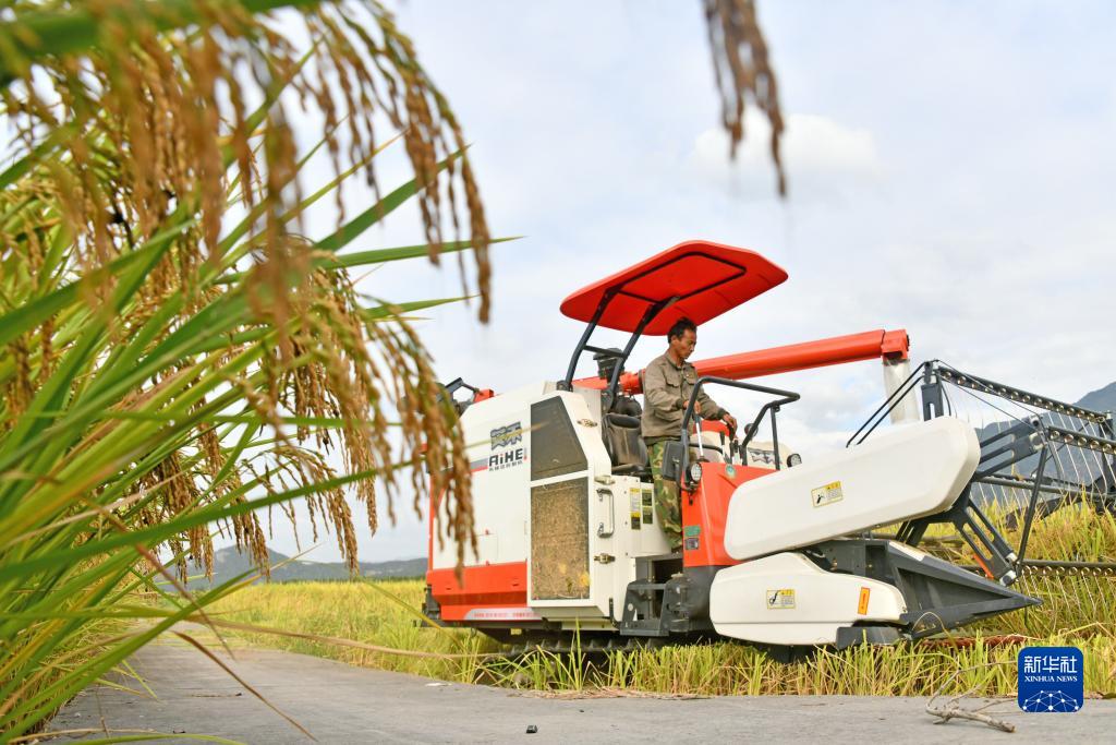 10月5日,浙江省臺州市仙居縣白塔鎮農民在收割水稻。