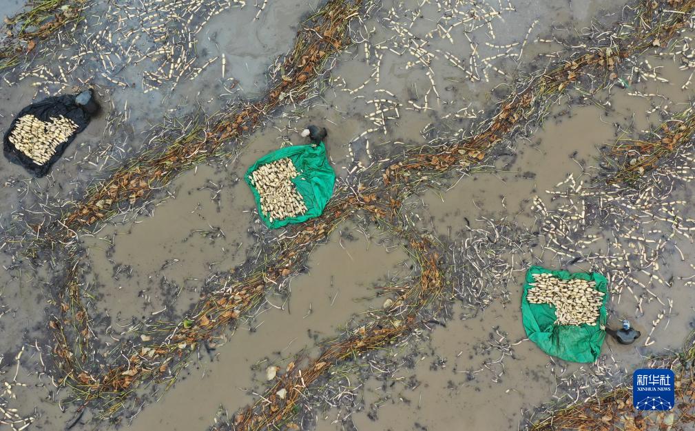 10月5日,河北省新河縣西流鄉西董村一家蓮藕種植合作社的社員在收獲蓮藕(無(wú)人機照片)。