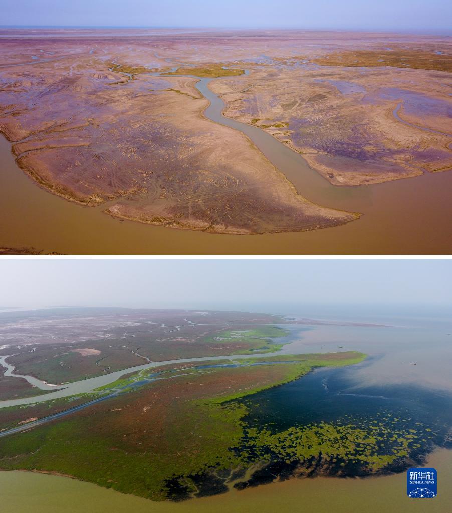 這是一張拼版照片:上圖為2018年6月23日拍攝的山東黃河三角洲國家級自然保護區互花米草未治理時(shí)的畫(huà)面;下圖為2021年10月27日拍攝的山東黃河三角洲國家級自然保護區互花米草治理后的畫(huà)面(無(wú)人機照片)。近年來(lái),保護區實(shí)施黃河三角洲濕地生態(tài)系統修復工程,開(kāi)展退耕還濕、退養還灘,推進(jìn)河口濕地自然修復和河湖生態(tài)聯(lián)通,有效恢復了濕地功能,提高了生物多樣性。