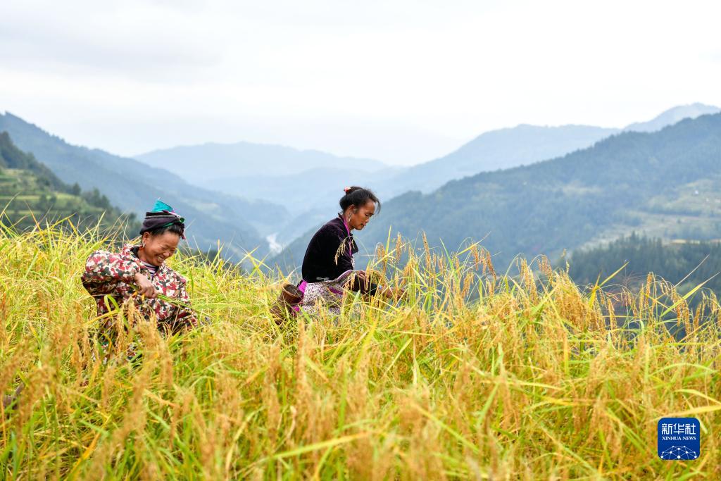 10月6日,農民在貴州省黎平縣雙江鎮黃崗村收割稻谷。
