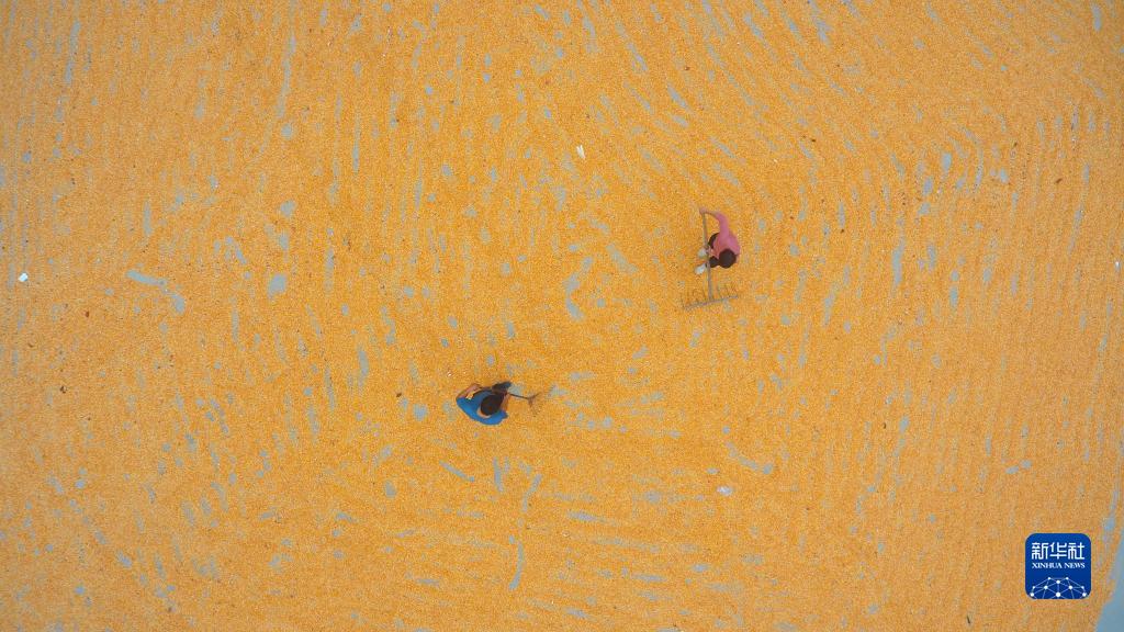 10月6日,在山東省聊城市茌平區賈寨鎮賈寨前村,村民在晾曬玉米粒(無(wú)人機照片)。