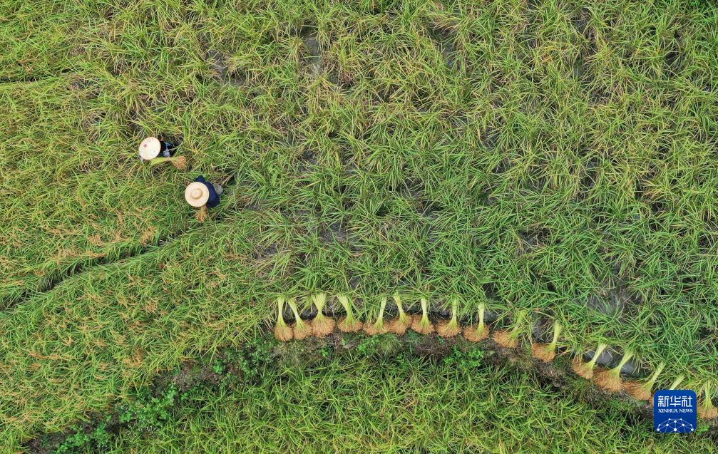 10月7日,村民在貴州省黔東南苗族侗族自治州從江縣剛邊壯族鄉剛邊村采收糯稻(無(wú)人機照片)。