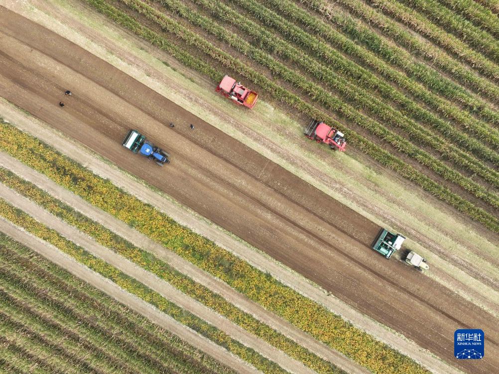 10月7日,石家莊市趙縣開(kāi)展農業(yè)全程機械化三秋演示會(huì ),引導農民利用現代農機做好農事管理和高效收獲(無(wú)人機照片)。