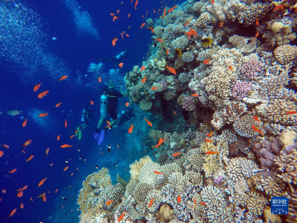 10月2日,人們在埃及西奈半島達哈布藍洞內的珊瑚旁深潛。
