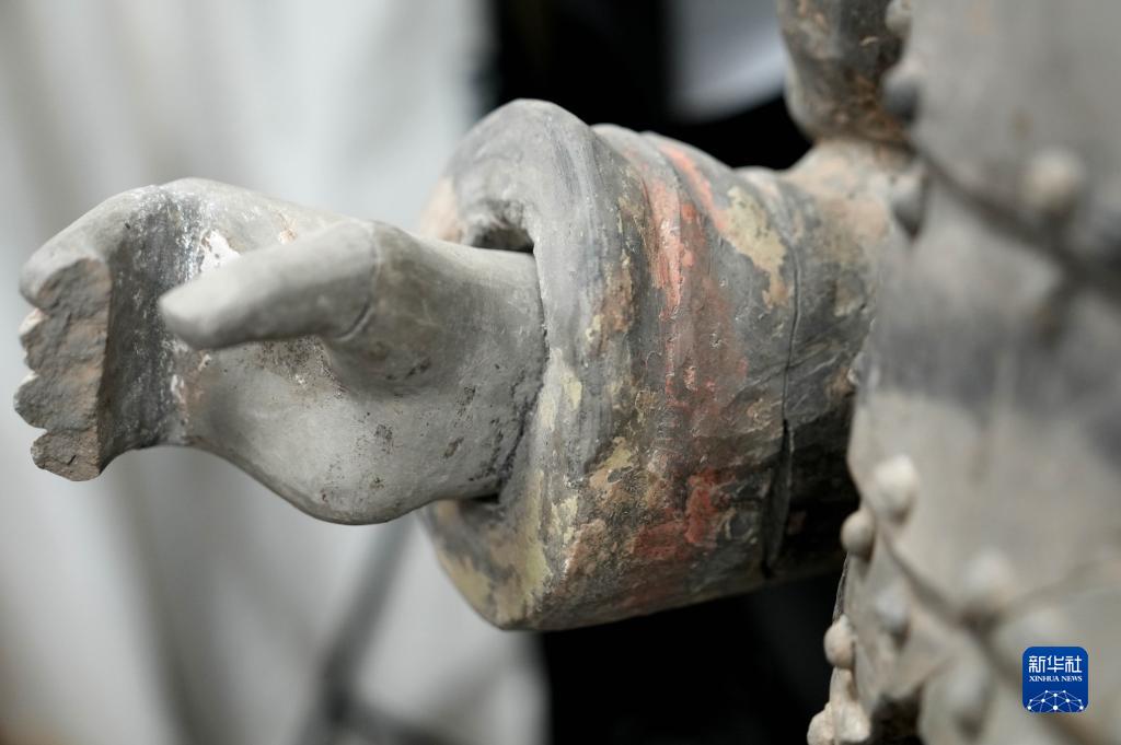 這是秦俑衣袖上的彩繪還原修復后的樣貌(8月23日攝)。