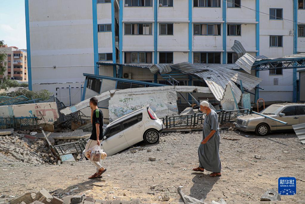 10月8日,在加沙城,人們走過(guò)被以色列空襲炸毀的一所學(xué)校的入口。