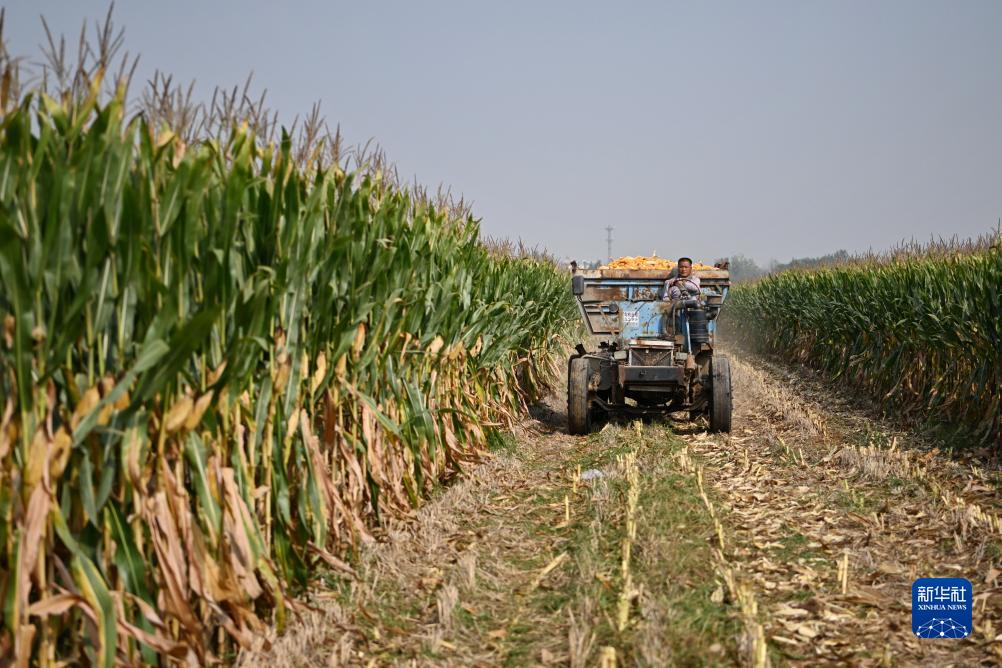 10月8日,農民在河北省隆堯縣雙碑鄉雙碑村田地內運輸剛剛收獲的玉米。