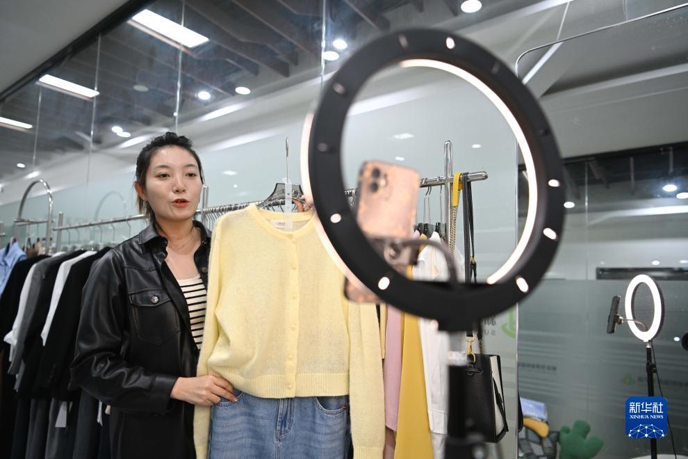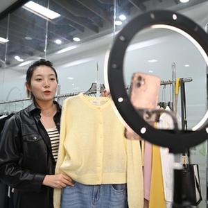 10月8日,石家莊新華區筑盈創(chuàng )業(yè)孵化基地一家服飾企業(yè)的員工通過(guò)直播銷(xiāo)售服裝。