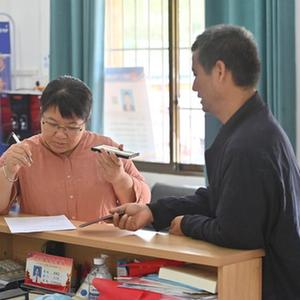 楊寧(左)在辦公室為村民辦事(10月8日攝)。