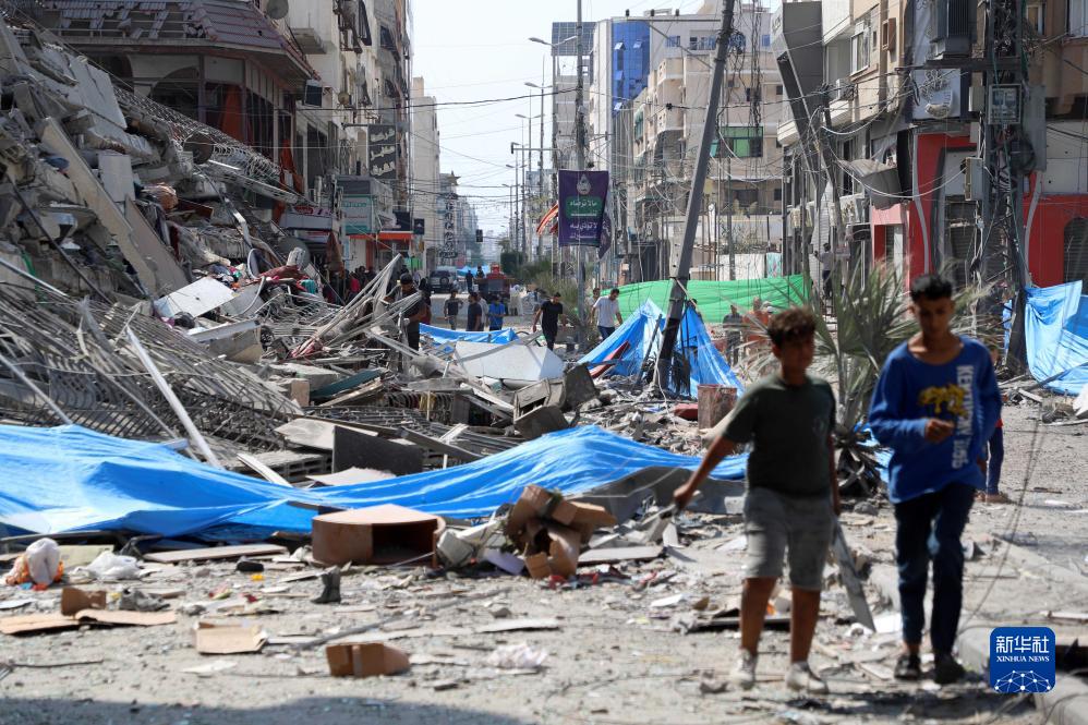 10月8日,巴勒斯坦人在加沙城查看以色列空襲后的街道。